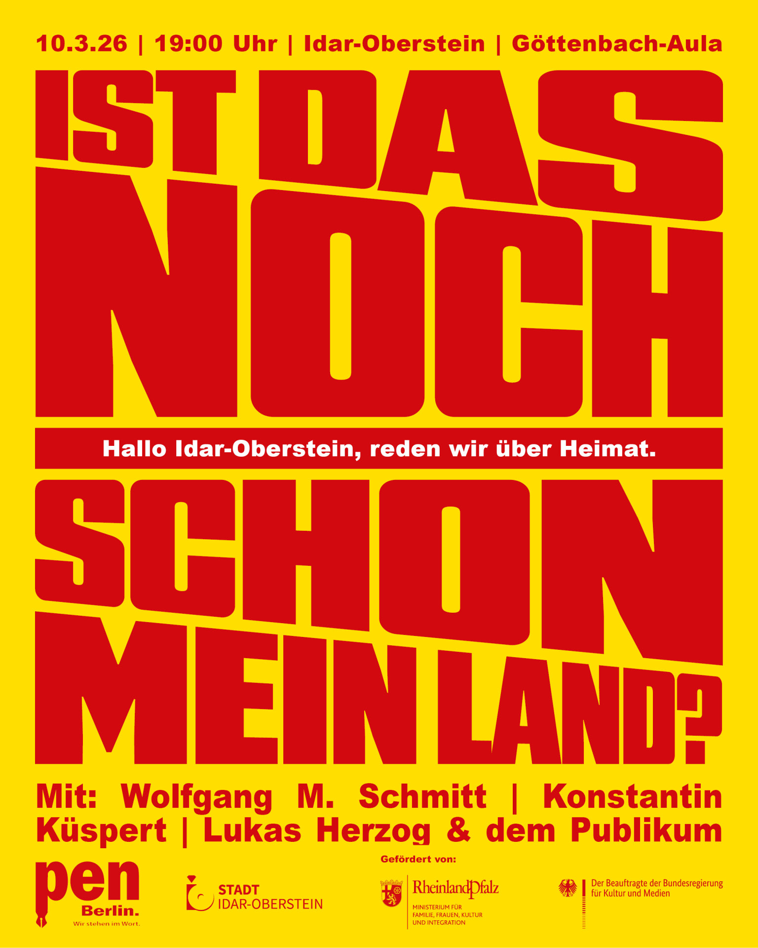 Idar-Oberstein - Where does home end, where does alienation begin? At a time when many people are wondering whether they still have a voice in their own environment, PEN Berlin poses the provocative question: "Is this still | already my country?" On March 10 at 7 p.m., the discussion series, which is touring throughout Rhineland-Palatinate, will be held in the Göttenbach-Aula Idar-Oberstein. High-profile guests will openly discuss the term "homeland".