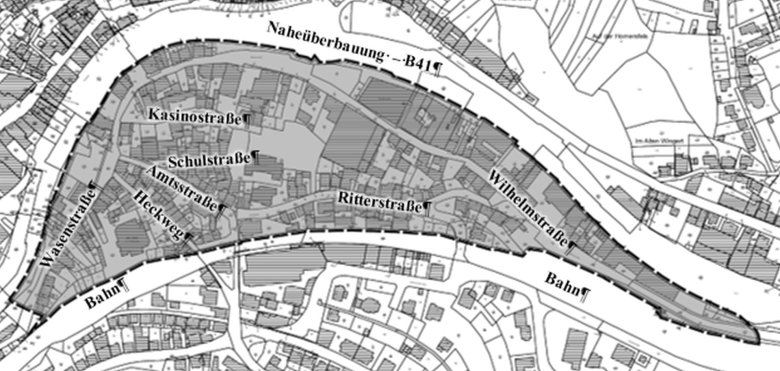 La zone du plan d'aménagement fait partie du centre-ville sud d'Oberstein, à proximité directe de la zone piétonne et de la gare. Il est délimité au nord par la route fédérale B41 et au sud par la voie ferrée. La superficie totale est d'environ 7,37 ha. La zone d'application est représentée en noir sur l'extrait de carte.